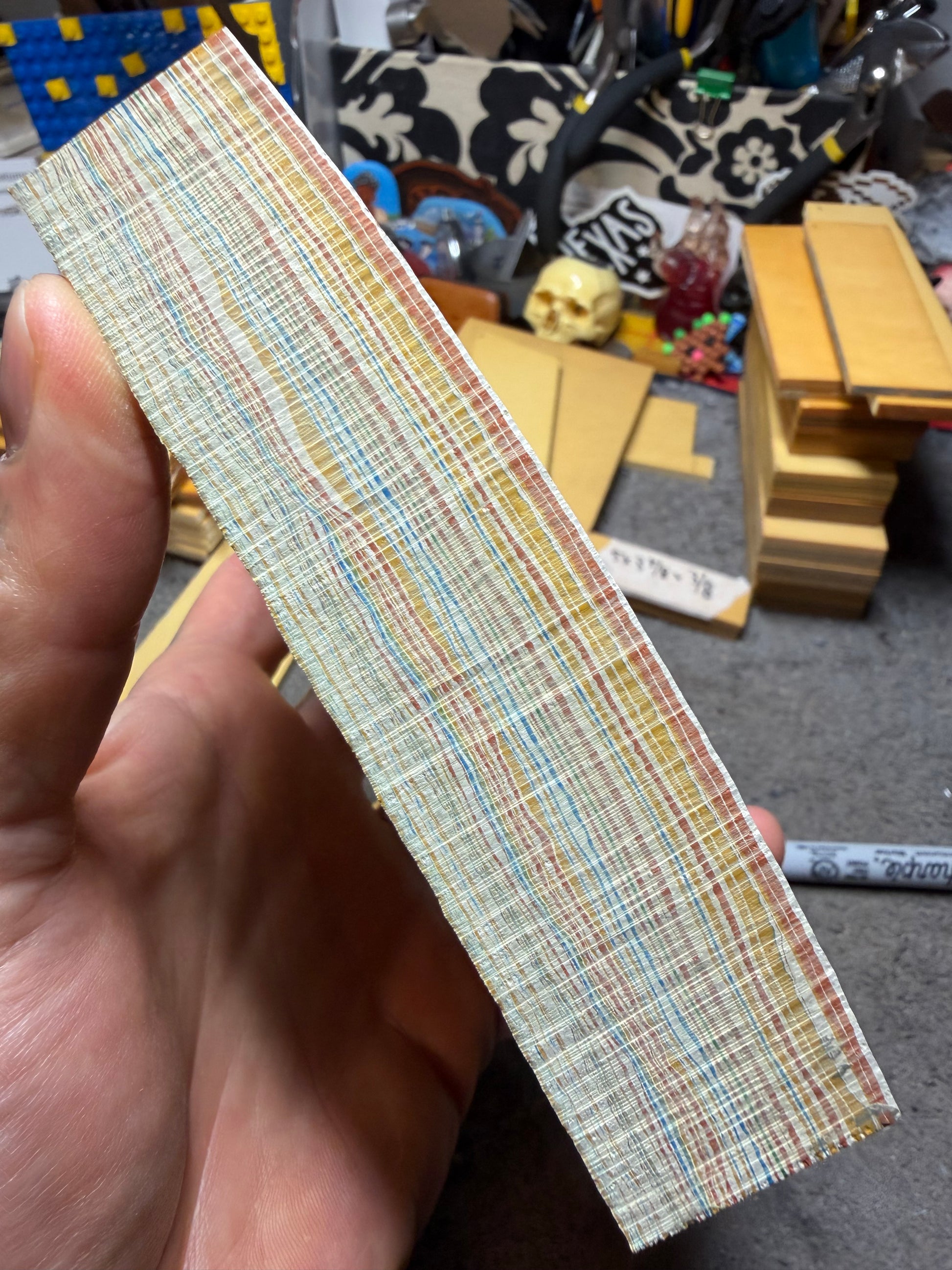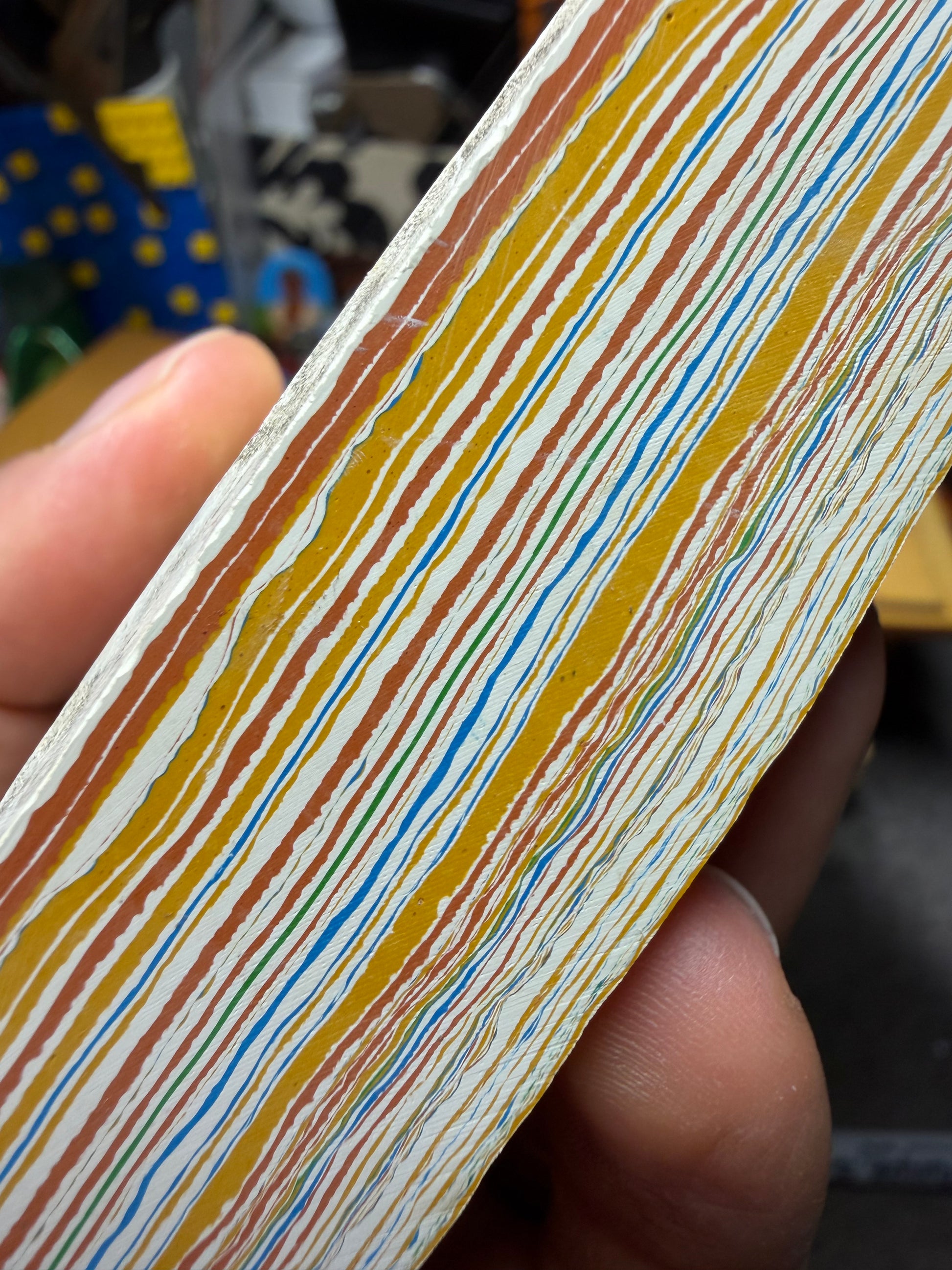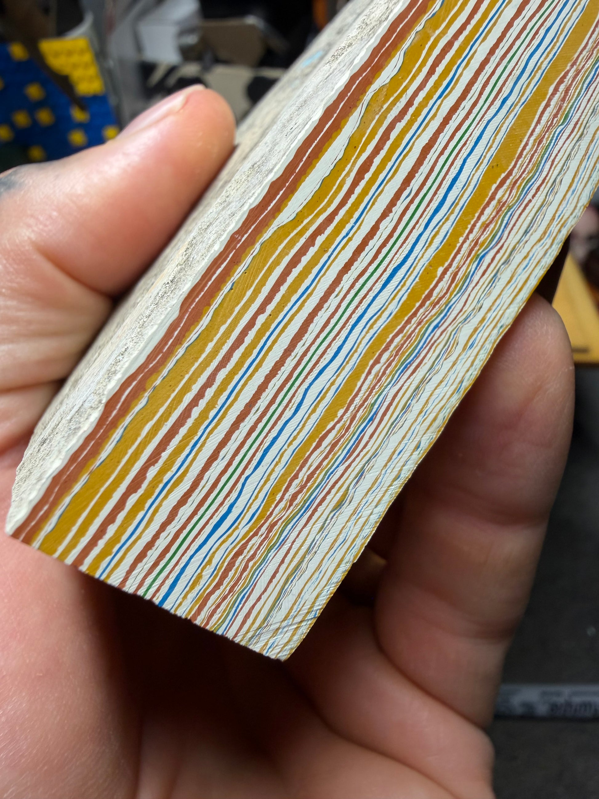 Stunning block of vintage 1960s Larson’s Boatite or Boat “Fordite”. This stuff is extremely rare to come across and especially in such a large piece. This can be ripped cross-cut to produce a bunch of sets of scales for thinner profile handles or used for many other EDC projects (Knucks/Beads/Rings).