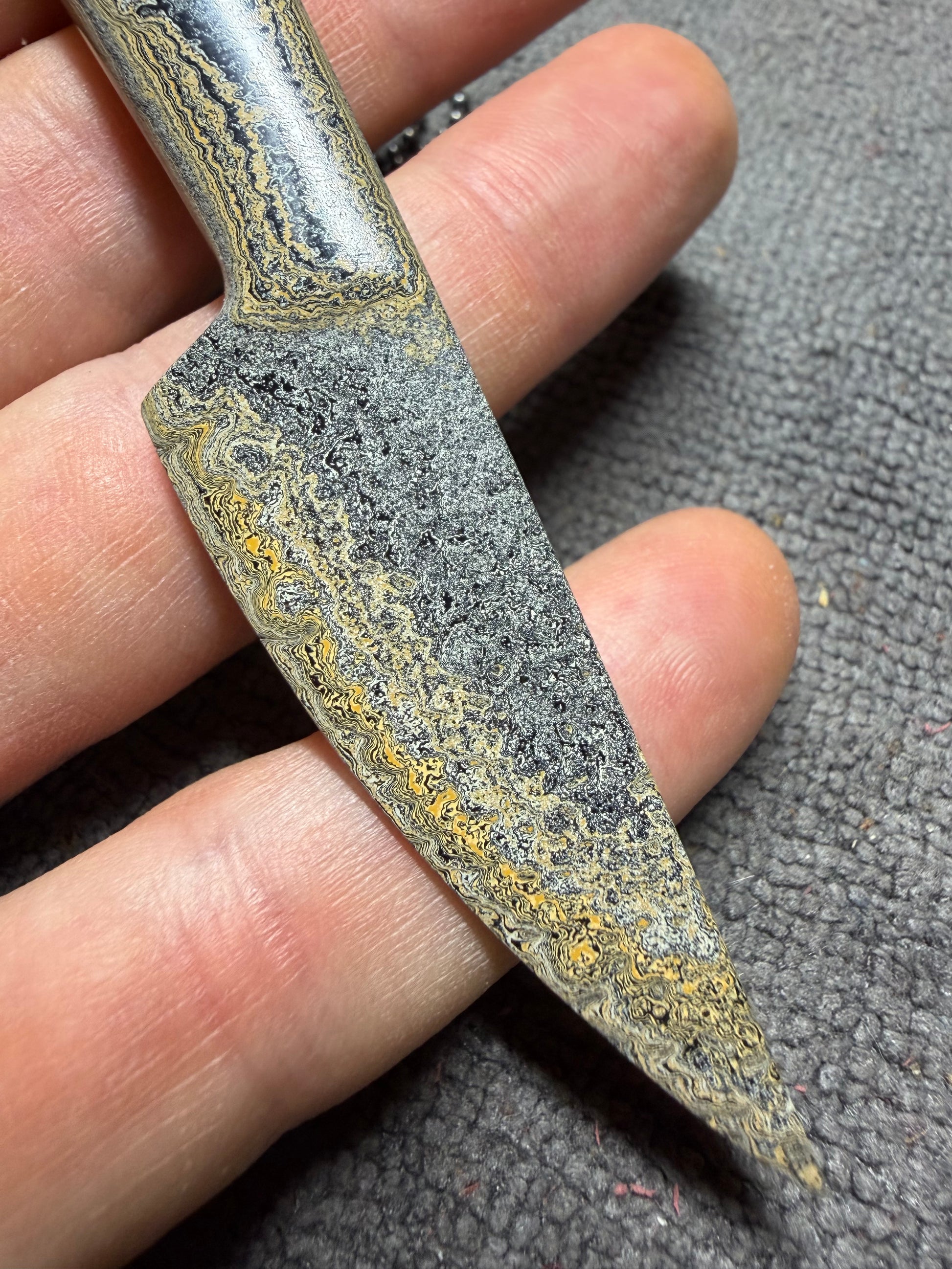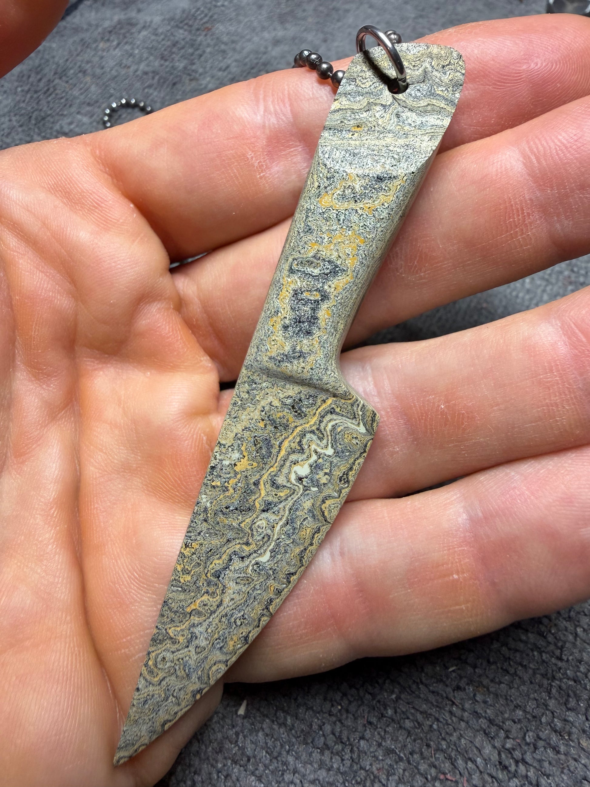 Custom 1-off Caterpillar Fordite knife pendant on stainless steel ball chain. Pendant measures 3 7/8” and is very light. This was made using Fordite from the Caterpillar factory.
