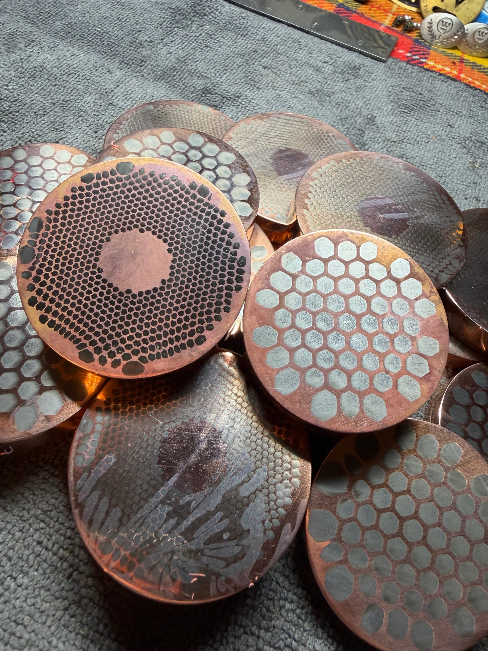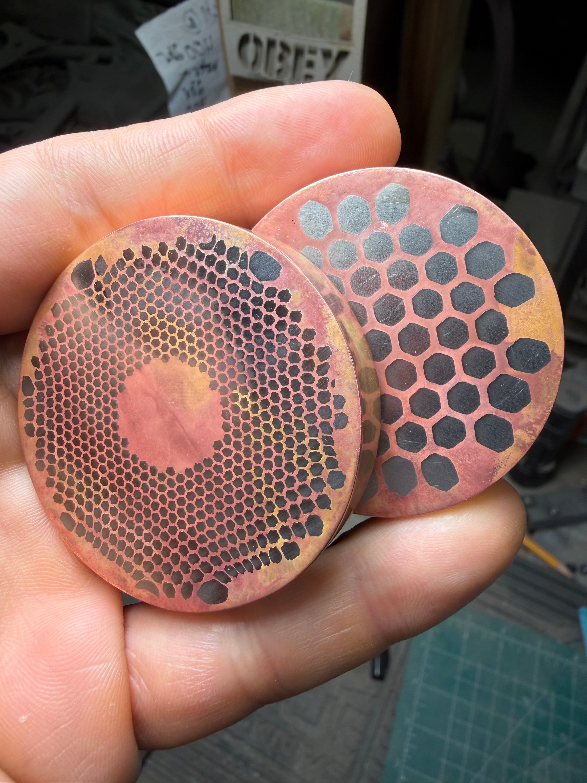 This material looks much better when etched to create some depth and contrast in the materials. These rounds come polished.
