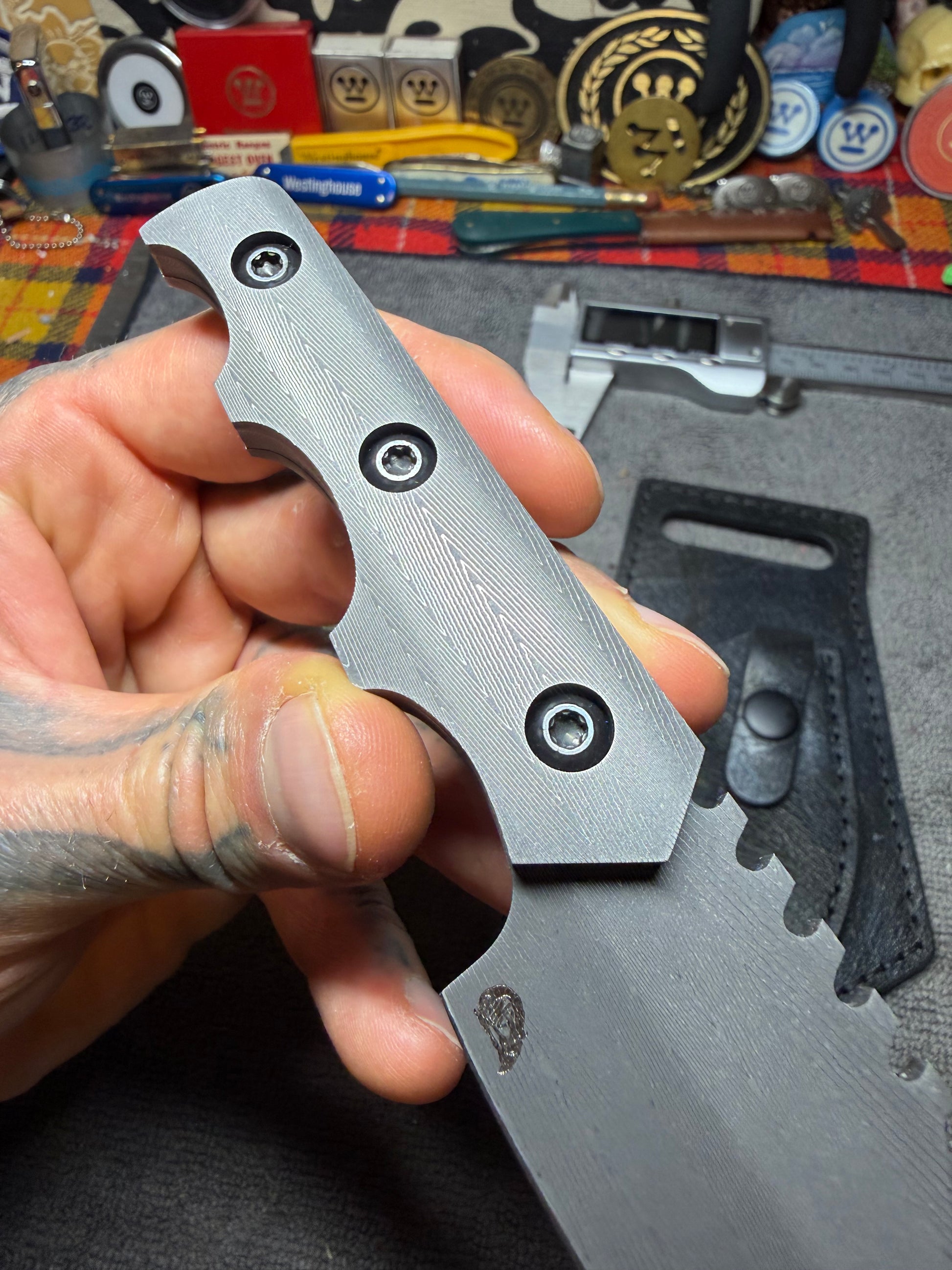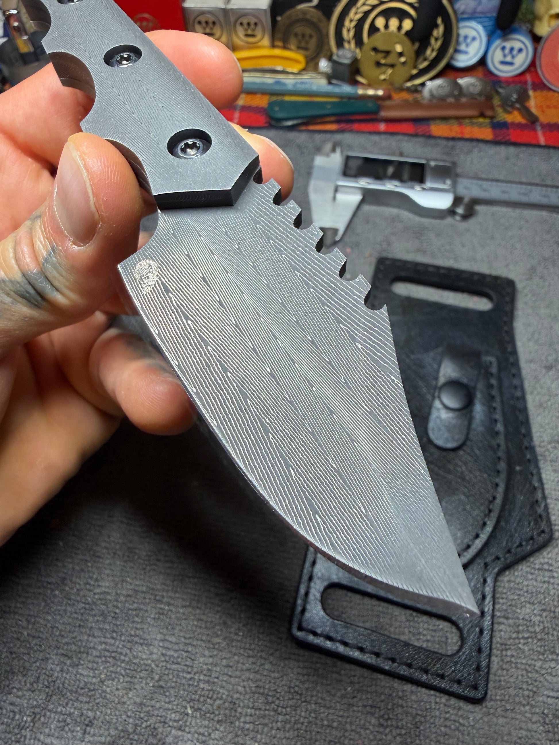 All Vegas Forge Herringbone Damascus HawkEye Bowie. I used VF Stainless Herringbone for the blade and handles on this custom. This one-off piece comes with a leather scout-carry sheath. Awesome piece of functional EDC art for hunting or self-defense.