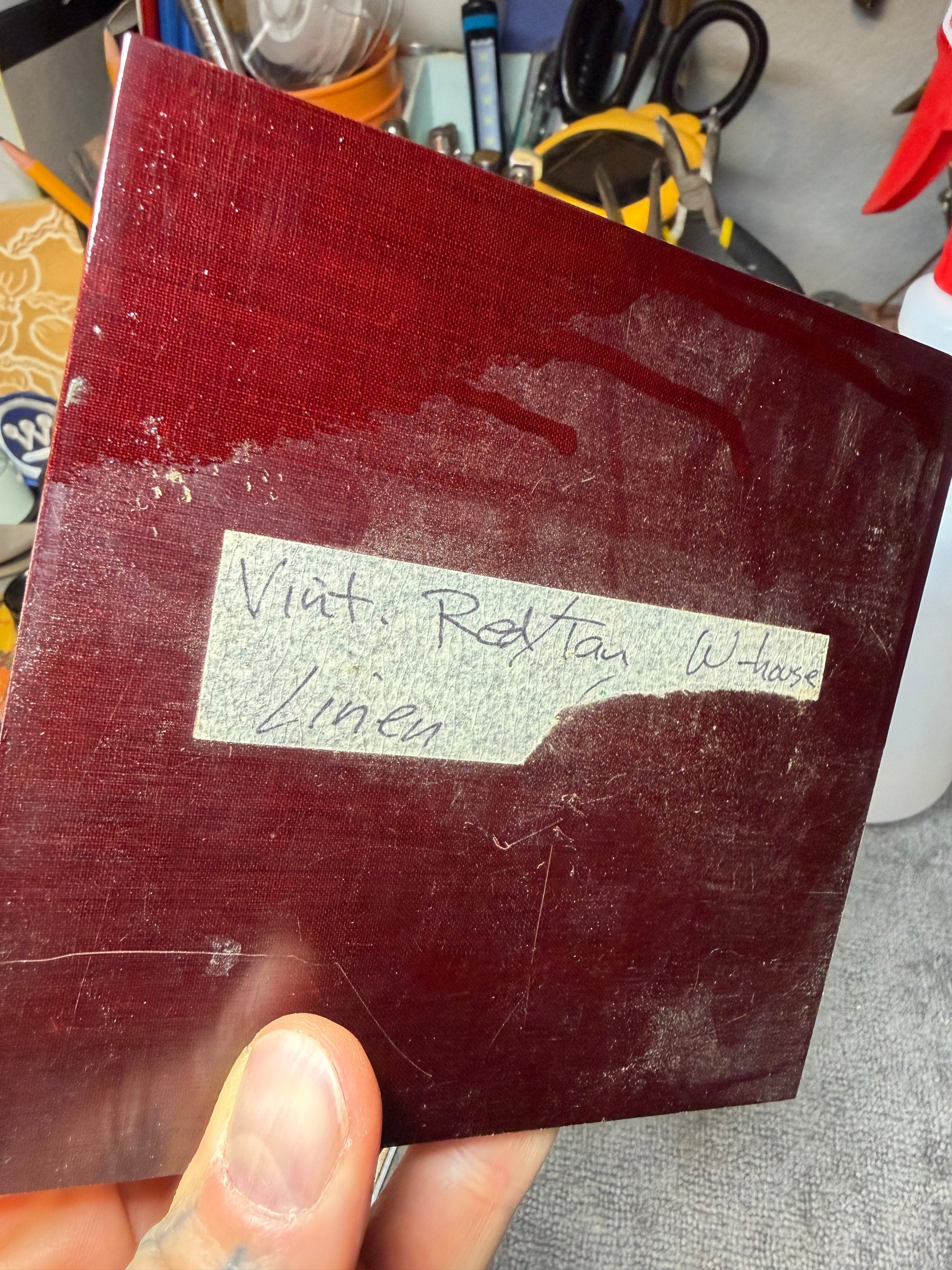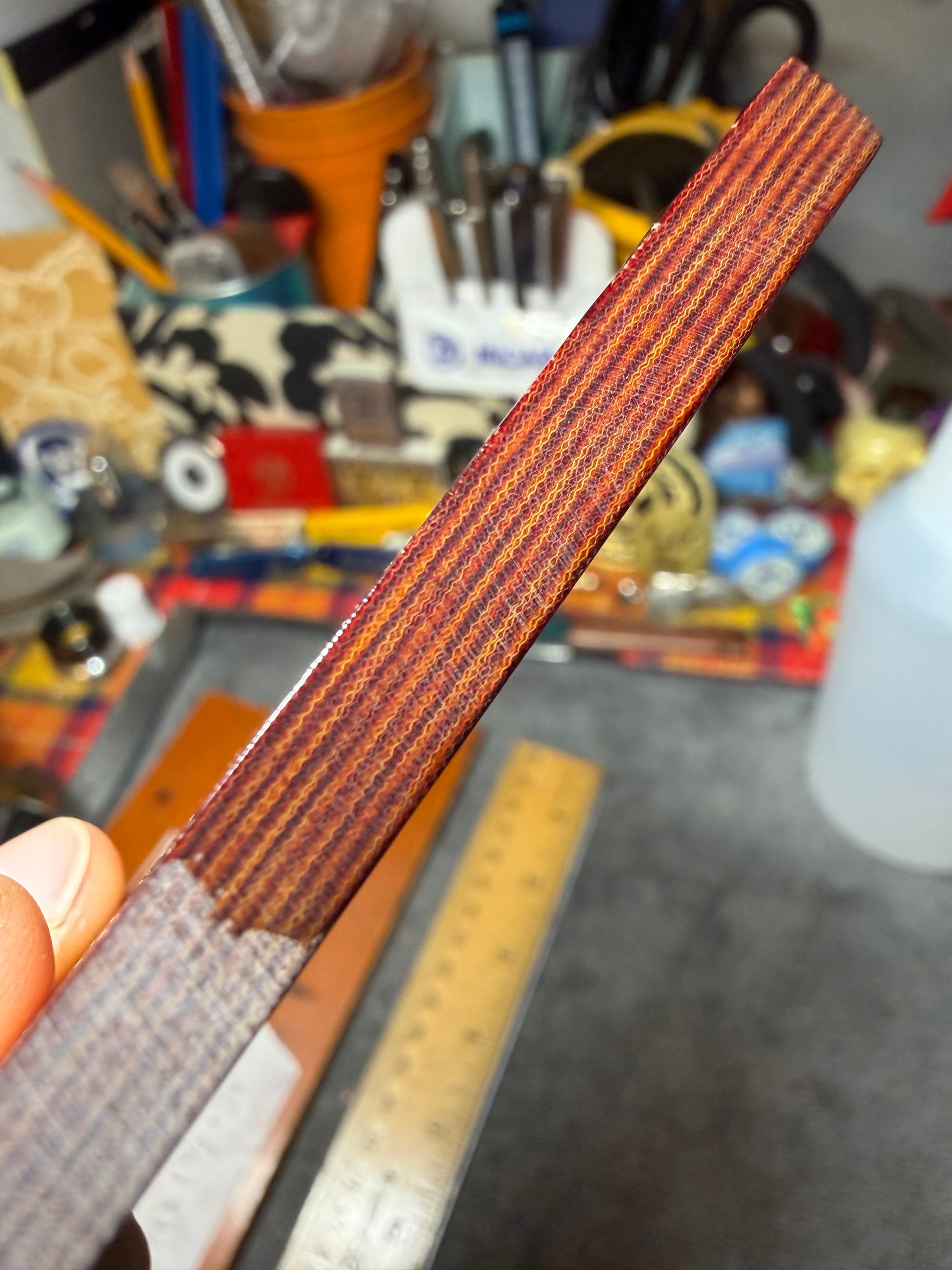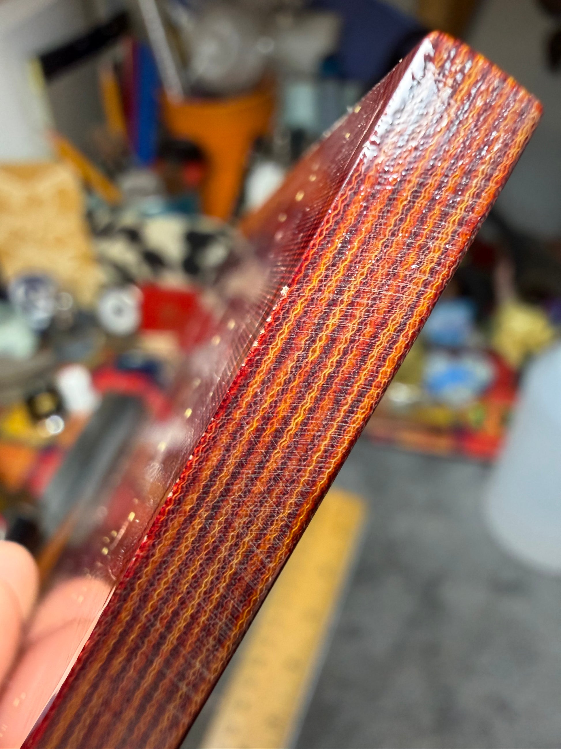 Vintage Westinghouse red/tan layered Linen Micarta. This stuff is very rare and wasn't produced very much back in the day. Utilize the lines on your contour or chamfer to maximize the potential for this piece! Should be big enough for 2 smaller folders.