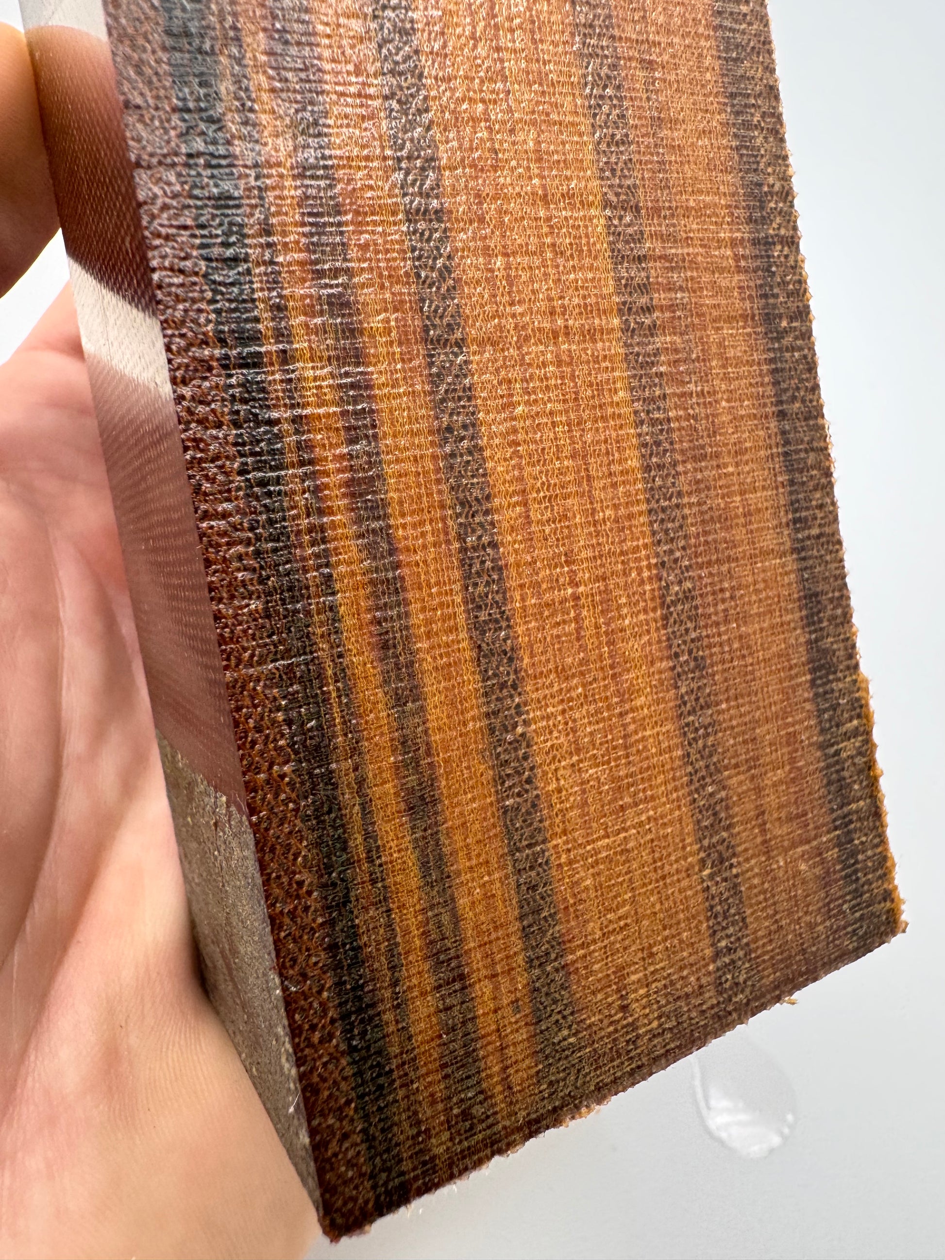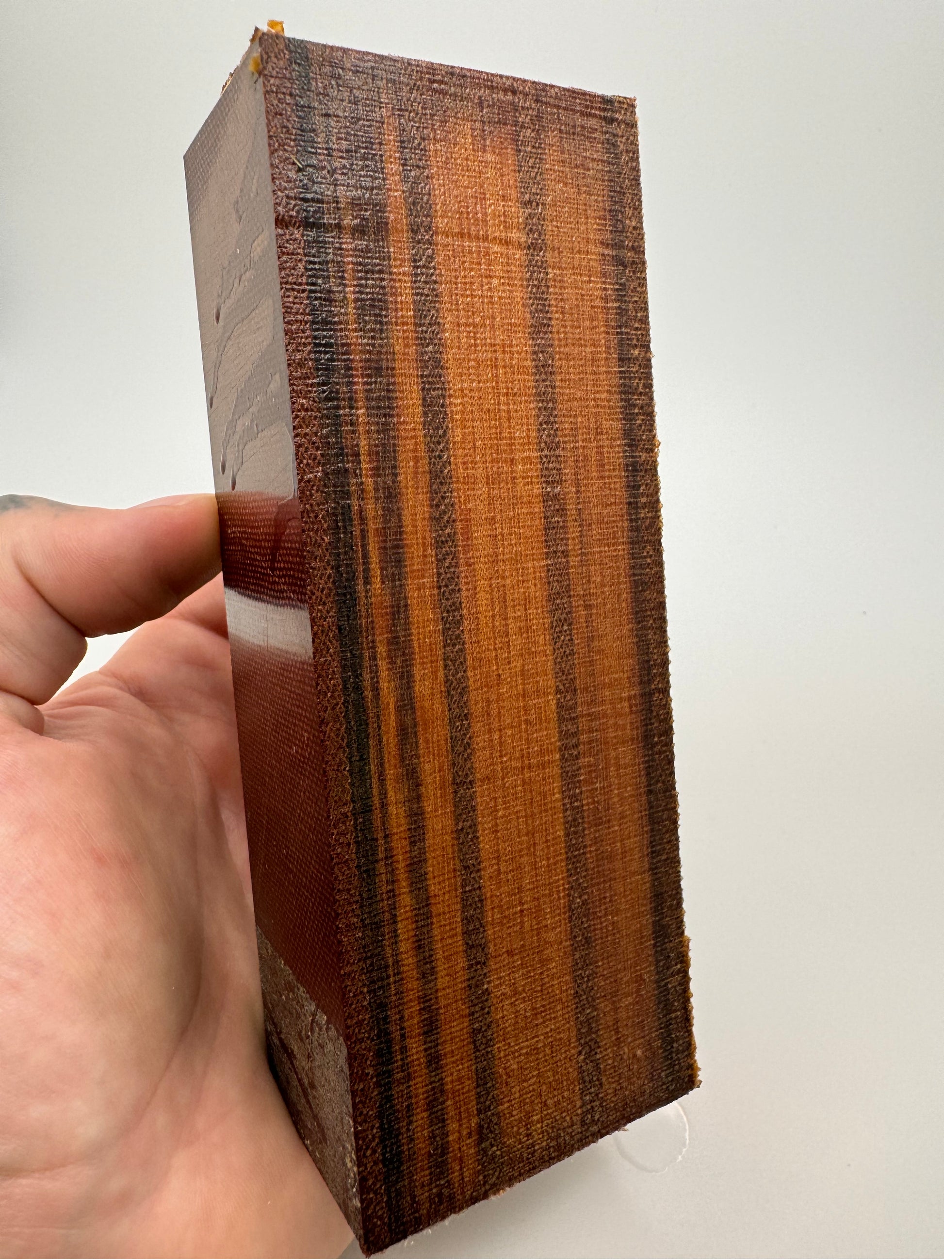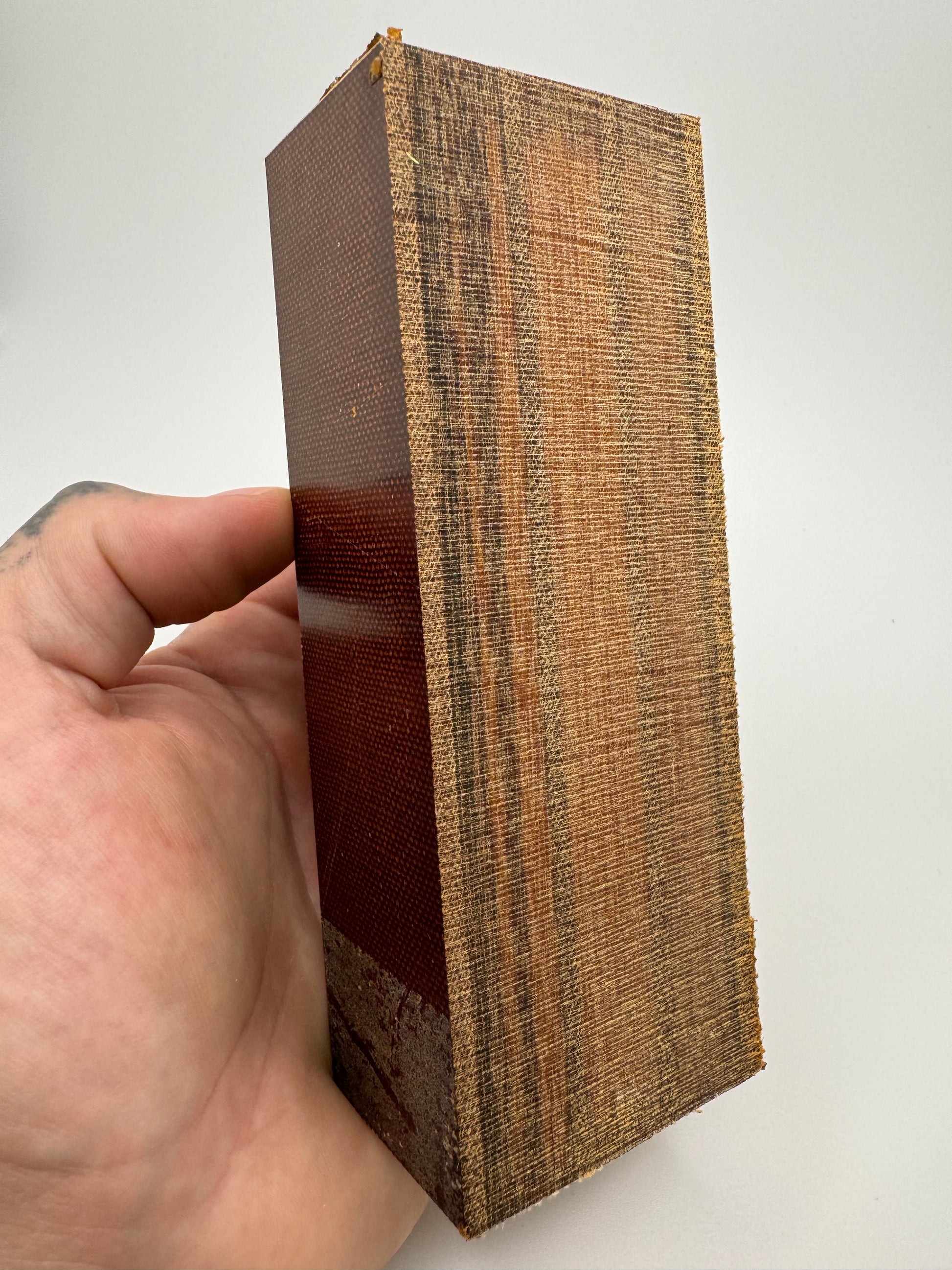 Over-sized Westinghouse "Sandwich" block with layered Canvas and Linen. The patina will be slightly different on all of these due to where they were in the large block when they were originally cut. These are cross-cut to show the different substrates of material on the face. Can be used as a block or ripped in a multitude of ways for scales.